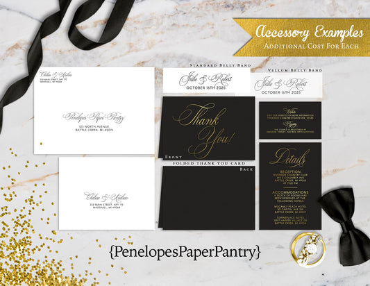 Luxury Gold Foil Typography on Black Paper Traditional Wedding Invitation, Sets, or Suite