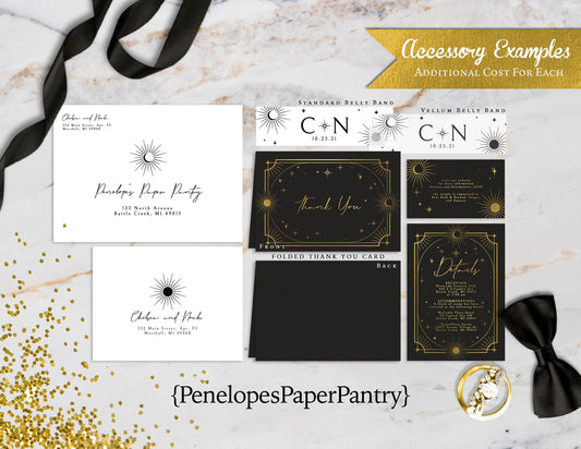 Luxury Gold Foil Ethereal Theme on Black Paper Traditional Wedding Invitation, Sets, or Suite