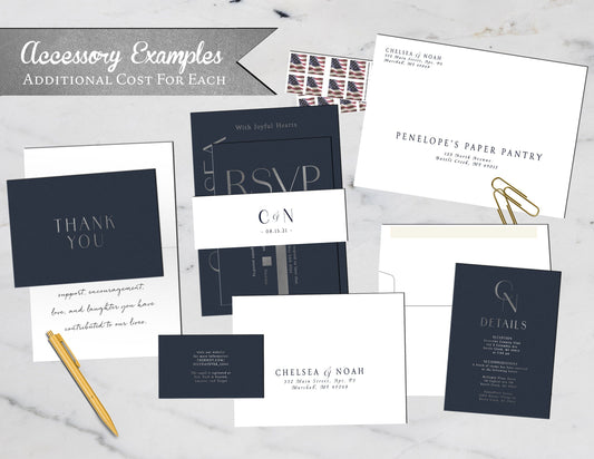 Luxury Gold Foil Typography on Navy Blue Paper Traditional Wedding Invitation, Sets, or Suite