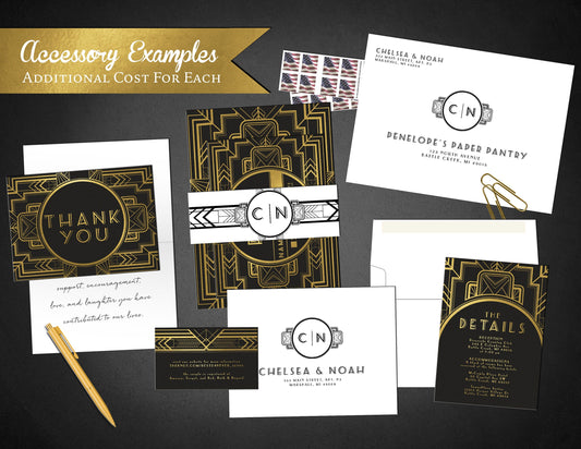 Luxury Gold Foil Art Deco on Black Paper Traditional Wedding Invitation, Sets, or Suite