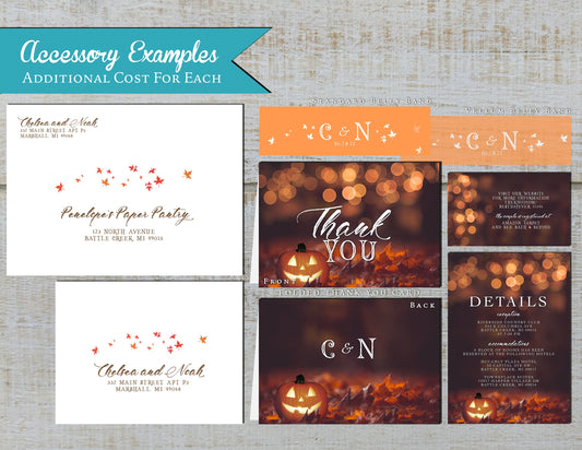 Romantic Halloween Fall Wedding Invitation Personalized Burnt Orange Bubble Lights Jack o lantern Autumn Leaves Shimmery Printed Invitations