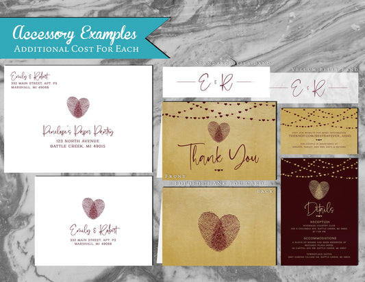 Burgundy Thumbprint Heart on Metallic Gold Paper Traditional Wedding Invitation, Sets, or Suite
