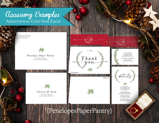 Chic Winter Wedding Invitation – ’Tis the Season to Be Married – Pine Laurels & Calligraphy Printed Invite with Envelopes
