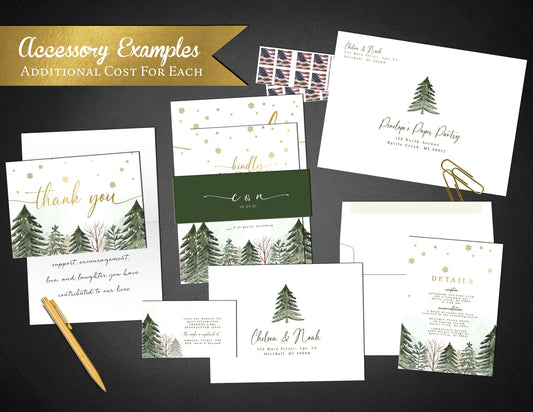 Chic Winter Wedding Invitation – Pine Tree Forest & Gold Foil Snowflakes – Personalized Printed Invite with Envelopes