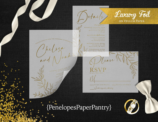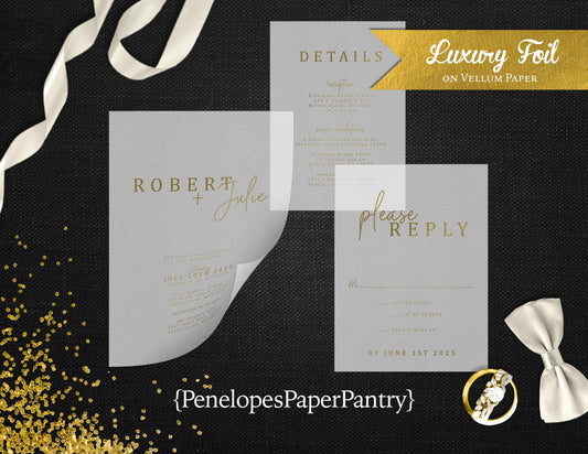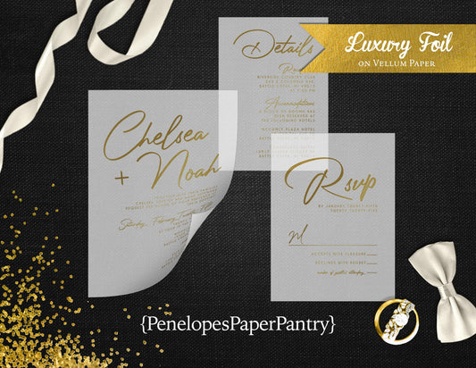 Vellum Typography with Gold Foil Wedding Invitaiton, Set, or Suite