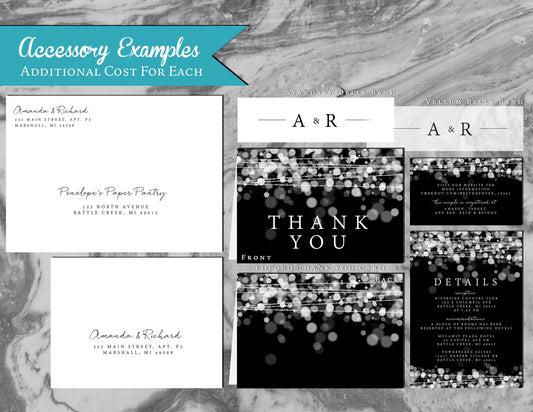 White Bokeh String Lights Bubble Lights with Black Background Traditional Wedding Invitation, Sets, or Suite