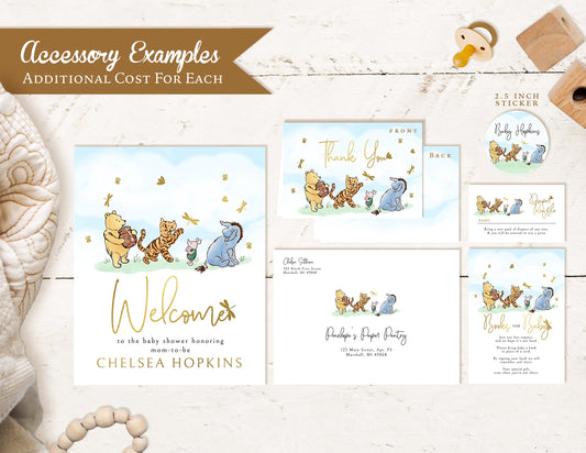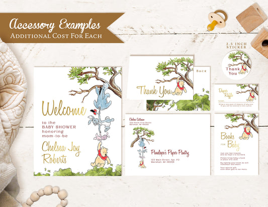 Winnie the Pooh Gender Neutral Baby Shower Invitation – Personalized Gold Foil Printed Invite with Eeyore, Rabbit & Piglet – Envelopes Included