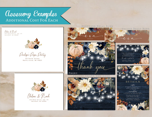 Rustic Fall Wedding Invitation – Personalized Navy & Barn Wood Design with Rust, White Pumpkins & Gold Shimmer – Printed with Envelopes Included
