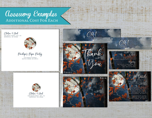 Rustic Fall Wedding Invitation – Full Moon Night Sky, Oak Tree & Burnt Orange Leaves – Romantic Personalized Printed Invitations with Envelopes Included