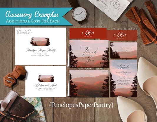 Romantic Fall Mountain Wedding Invitation – Personalized Burnt Orange Autumn Forest Design with Calligraphy – Printed with Envelopes Included