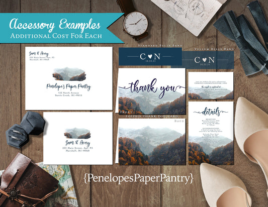 Romantic Mountain Fall Wedding Invitation – Autumn Leaves & Misty Mountains – Personalized “We Do” Printed Invitations with Envelopes Included