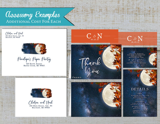 Rustic Full Moon Fall Wedding Invitation – Starry Sky, Autumn Leaves & Calligraphy – Personalized Printed Invitations with Envelopes Included