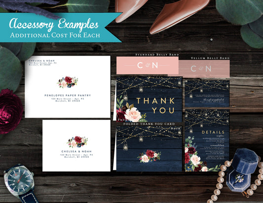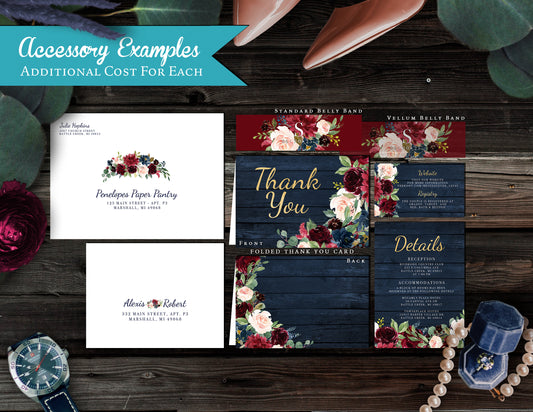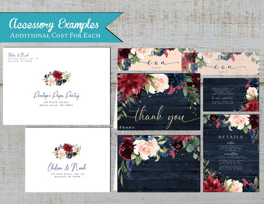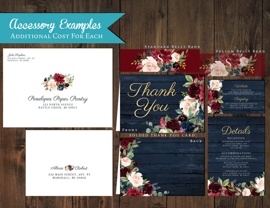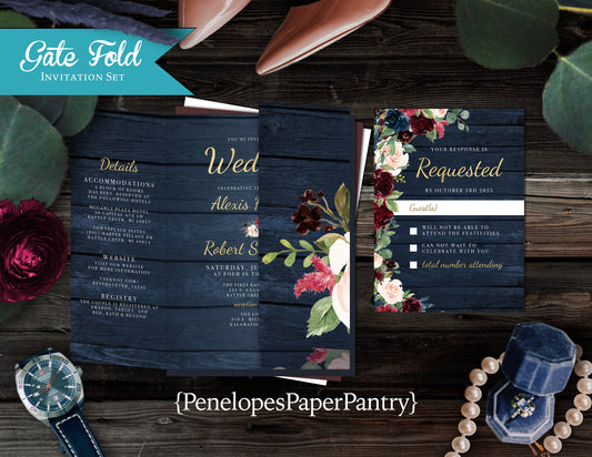 Rustic Navy Floral Fall Wedding Invitation – Burgundy Marsala Blush & Gold – Personalized Barn Wood Shimmery Printed Invite with Envelopes