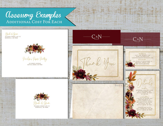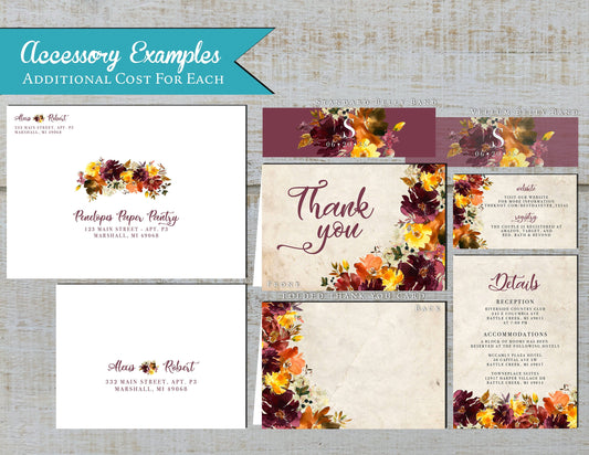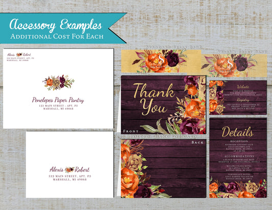Rustic Floral Fall Wedding Invitation – Burgundy & Burnt Orange Florals, Parchment Background & Calligraphy – Personalized Printed Invitations with Envelopes