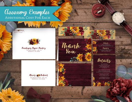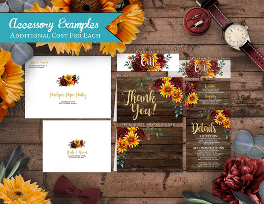 Rustic Fall Wedding Invitation – Sunflowers & Burgundy Roses, Barn Wood & Gold Calligraphy – Personalized Shimmery Printed Invitations with Envelopes Included