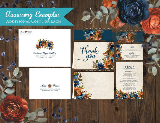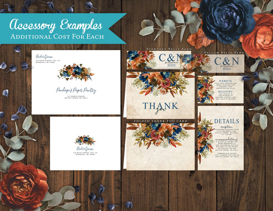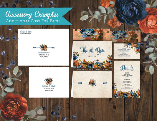 Rustic Navy Floral Fall Wedding Invitation – Turquoise & Burnt Orange with Gold Shimmer – Personalized Barn Wood Printed Invite + Envelopes