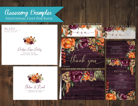 Rustic Purple & Orange Fall Wedding Invitation – Plum, Burnt Orange & Gold Print – Personalized Shimmery Printed Invitation with Envelope Included