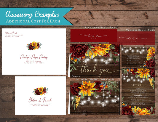 Rustic Sunflower Fall Wedding Invitation – Barn Wood, Burgundy Roses & Fairy Lights – Personalized Gold Shimmery Printed Invitations by Penelope’s Paper Pantry
