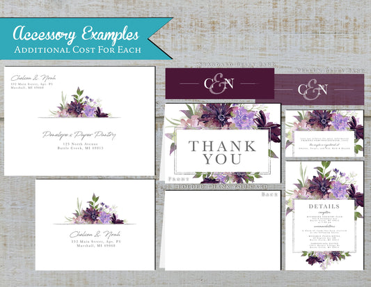 Elegant Purple Floral Summer Wedding Invitation Personalized Lavender Dark Purple Calligraphy Shimmery Printed Invitations Envelope Included