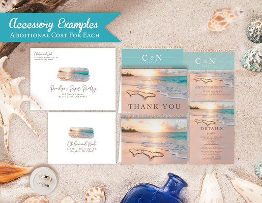 Romantic Beach Wedding Invitation Personalized Sunset Hearts In The Sand Destination Hawaii Shimmery Printed Invitations Envelopes Included