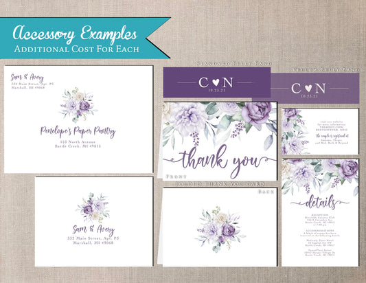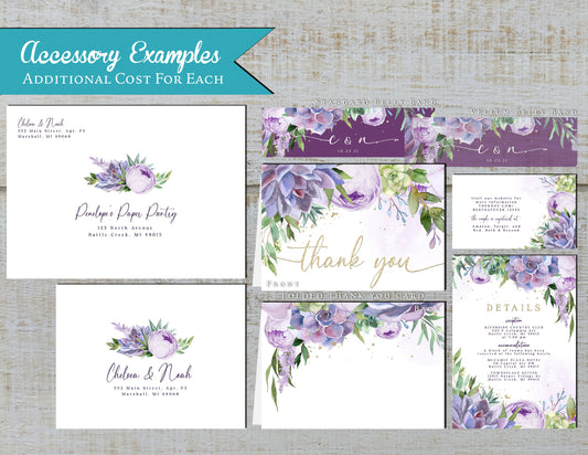 Elegant Purple Floral Summer Wedding Invitation Personalized Wedding Invite Lavender Roses Succulents Printed Invitations Envelopes Included