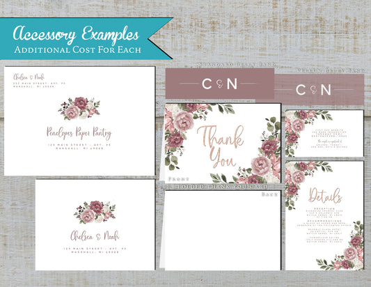Elegant Mauve Floral Summer Wedding Invitation Personalized Dusty Rose Blush Roses Calligraphy Shimmery Printed Invitation Envelope Included