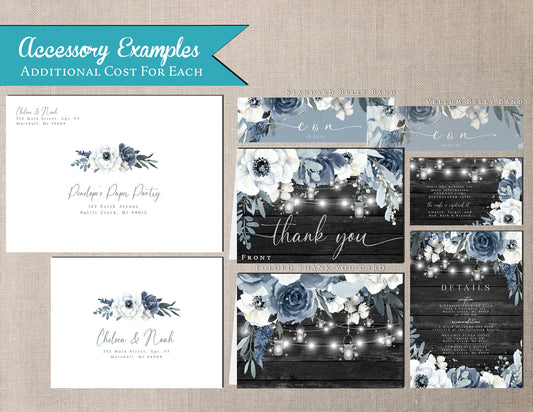 Elegant Rustic Dusty Blue Floral Summer Wedding Invitation Personalized Gray Barn Wood Glowing Lights Shimmery Printed Invitations Envelopes