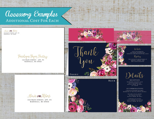 Navy and Pink Floral Summer Wedding Invitation,Summer Wedding Invite,Magenta,Cornflower Blue,Gold,Shimmery,Personalize,Printed Invitation