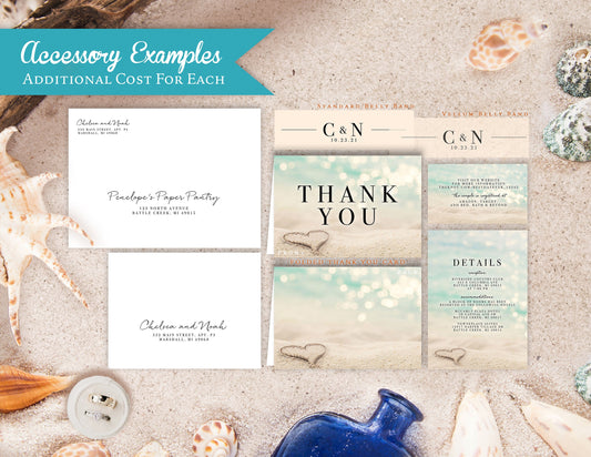 Romantic Beach Wedding Invitation Personalized Heart in the Sand Shimmery Destination Tropical Hawaii Printed Invitation Envelope Included