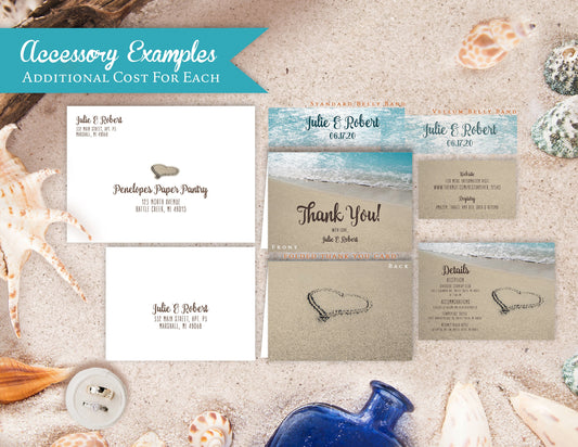 Romantic Beach Wedding Invitation Personalized Heart in the Sand Blue Beige Destination Tropical Hawaii Printed Invitation Envelope Included