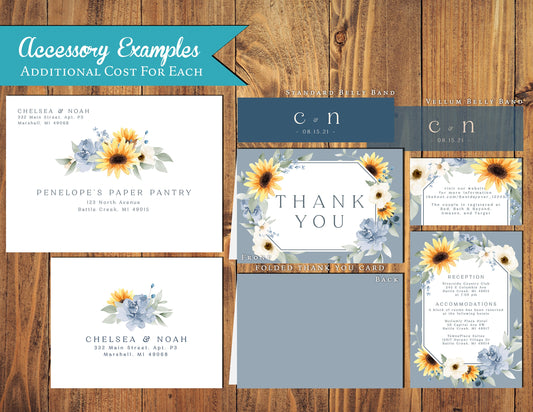 Shabby Chic Dusty Blue Floral Summer Wedding Invitation Personalized Sunflowers Wildflowers Geometric Frame Printed Invitation With Envelope