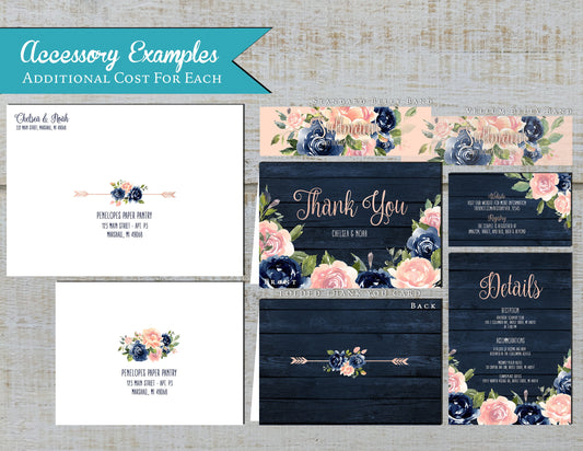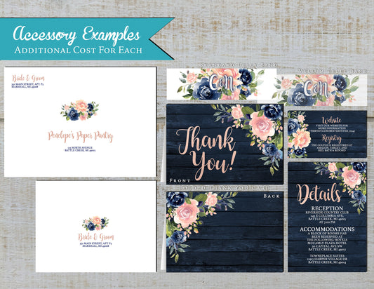 Rustic Navy and Pink Floral Summer Wedding Invitation Personalized Barn Wood Blush Roses Calligraphy Shimmery Printed Invitations Envelopes