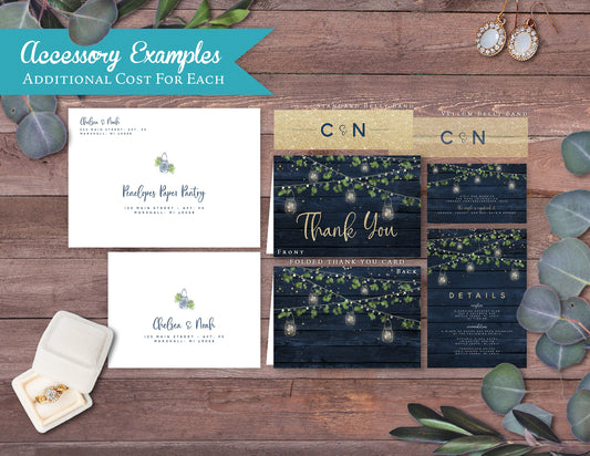 Rustic Summer Wedding Invitation,Summer Wedding Invite,Mason Jar Lights,Greenery,Navy Barn Wood,Personalize,Printed Invitation,Envelope