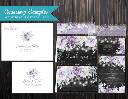 Rustic Gray Floral Summer Wedding Invitation Personalized Barn Wood Purple Lavender Lilac Fairy Lights Printed Invitation Envelopes Included
