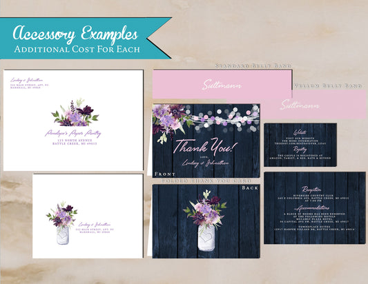 Rustic Navy Floral Summer Wedding Invitation Personalized Mason Jar Lavender Lilacs Fairy Lights Navy Barn Wood Printed Invitation Envelopes