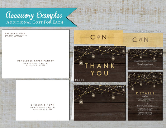 Rustic Wedding Invitation,Rustic Wedding Invite,Rustic Wood,Mason Jar Light,Twinkling Light,Gold Print,Personalize,Shimmery,Envelope,Printed