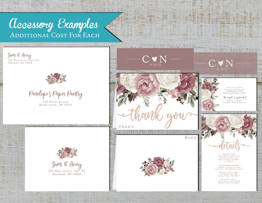 Whimsical Mauve Floral Summer Wedding Invitation,Set,Suite,Dusty Rose,Roses,Rose Gold,Shimmery,Personalize,Printed Invitation,Envelope