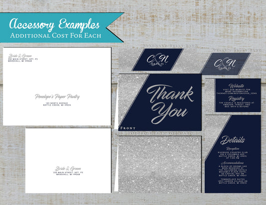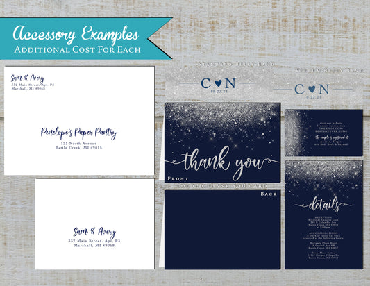 Silver Faux Glitter with Navy Blue Background Invitation Traditional Wedding Invitation, Sets, or Suite