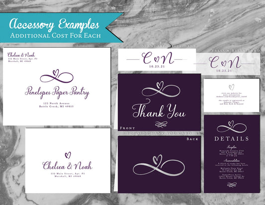 Purple Infinity Heart Eternal Love on White Paper Traditional Wedding Invitation, Sets, or Suite