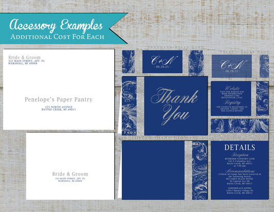 Royal Blue with Faux Silver Glitter Border and Lace Traditional Wedding Invitation, Sets, or Suite
