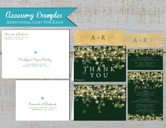 Gold Bokeh String Lights and Celtic Love Knot with Green Background Traditional Wedding Invitation, Sets, or Suite