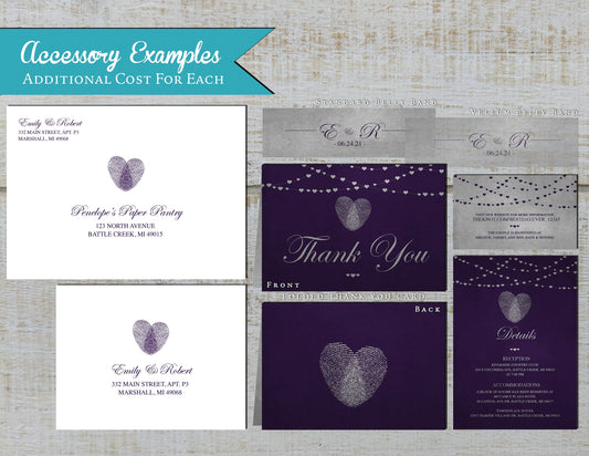 Purple Thumbprint Heart on Metallic Silver Paper Traditional Wedding Invitation, Sets, or Suite