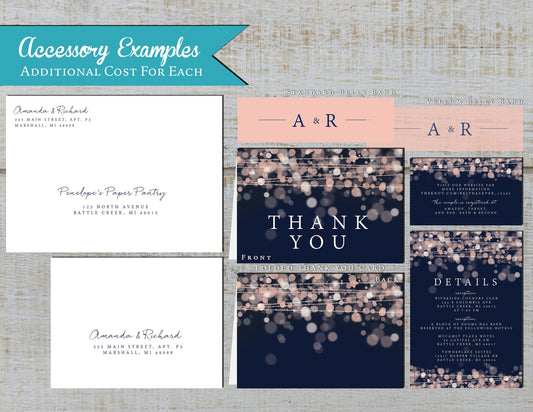 Pink Bokeh String Lights Bubble Lights with Navy Blue Background Traditional Wedding Invitation, Sets, or Suite