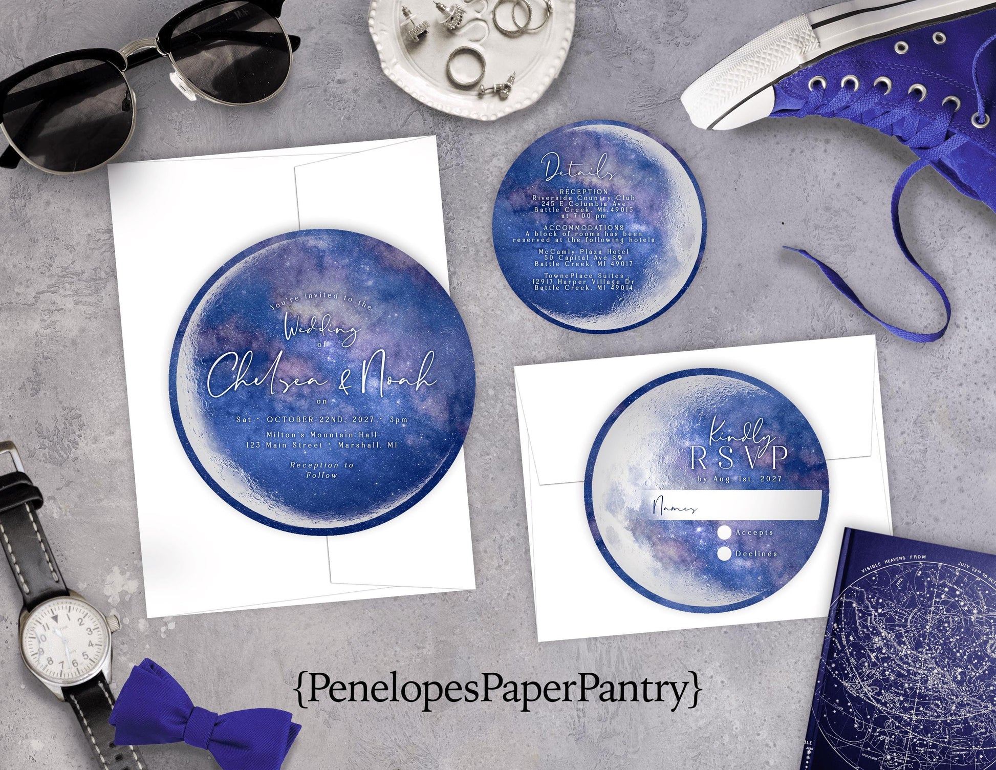 Die Cut Circle Blue Celestial Constellation Traditional Wedding Invitation, Sets, or Suite