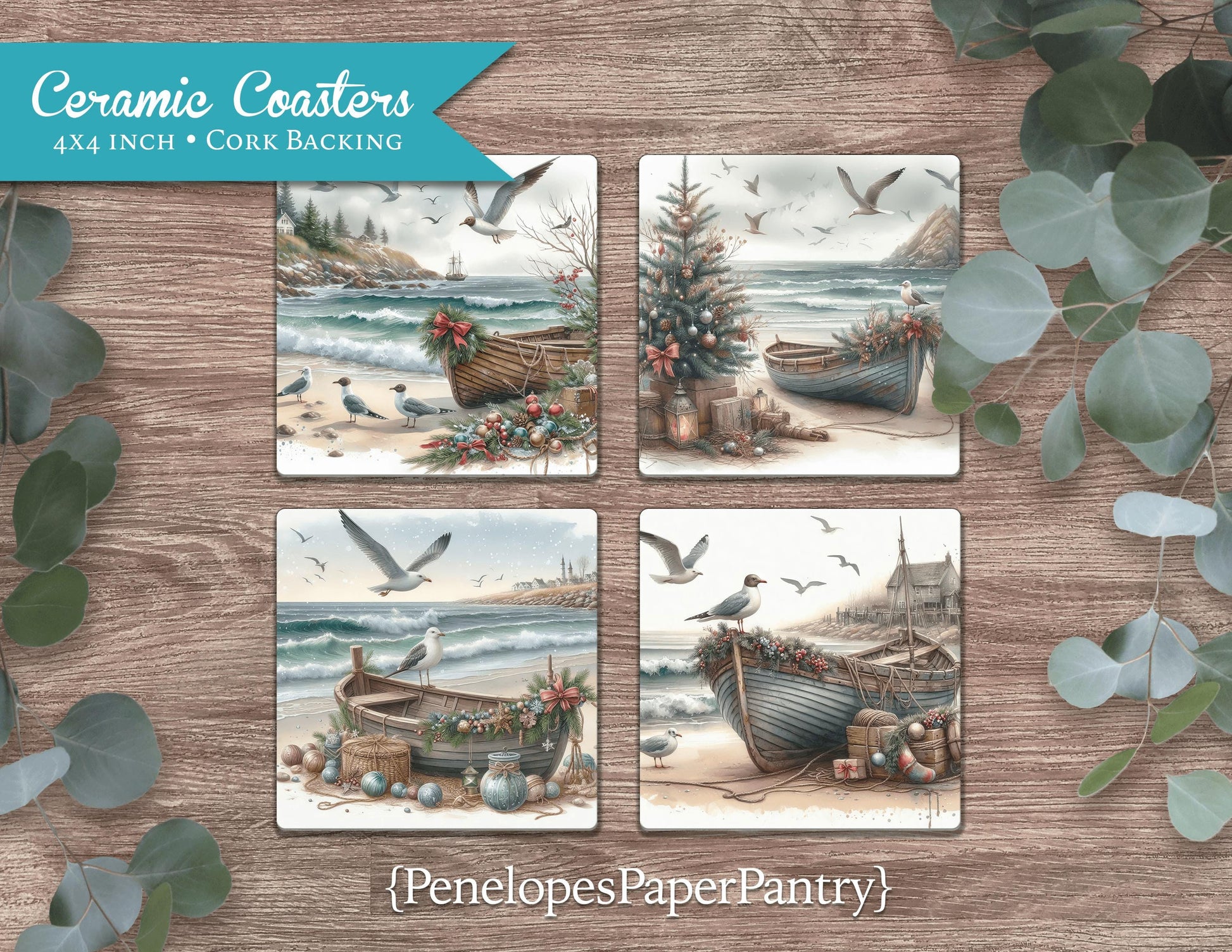 Coastal Christmas Ceramic Coasters Set Of Four Printed Coasters Holiday Home Decor Gift For Her Gift For Him Unique Gift Stocking Stuffer