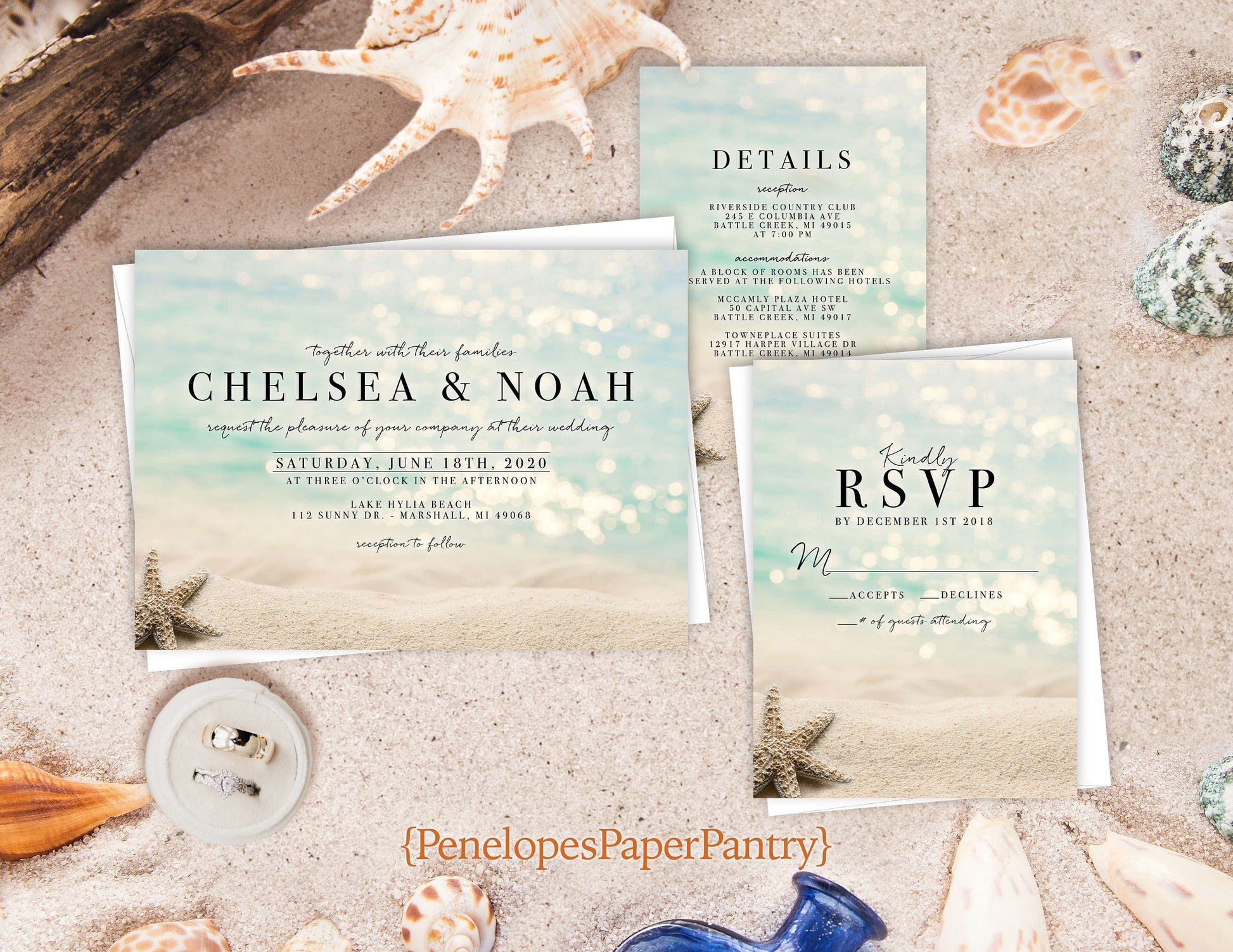 Elegant Beach Wedding Invitation Personalized Starfish Sandy Beach Crystal Blue Water Sunshine Shimmery Printed Invitations With Envelopes