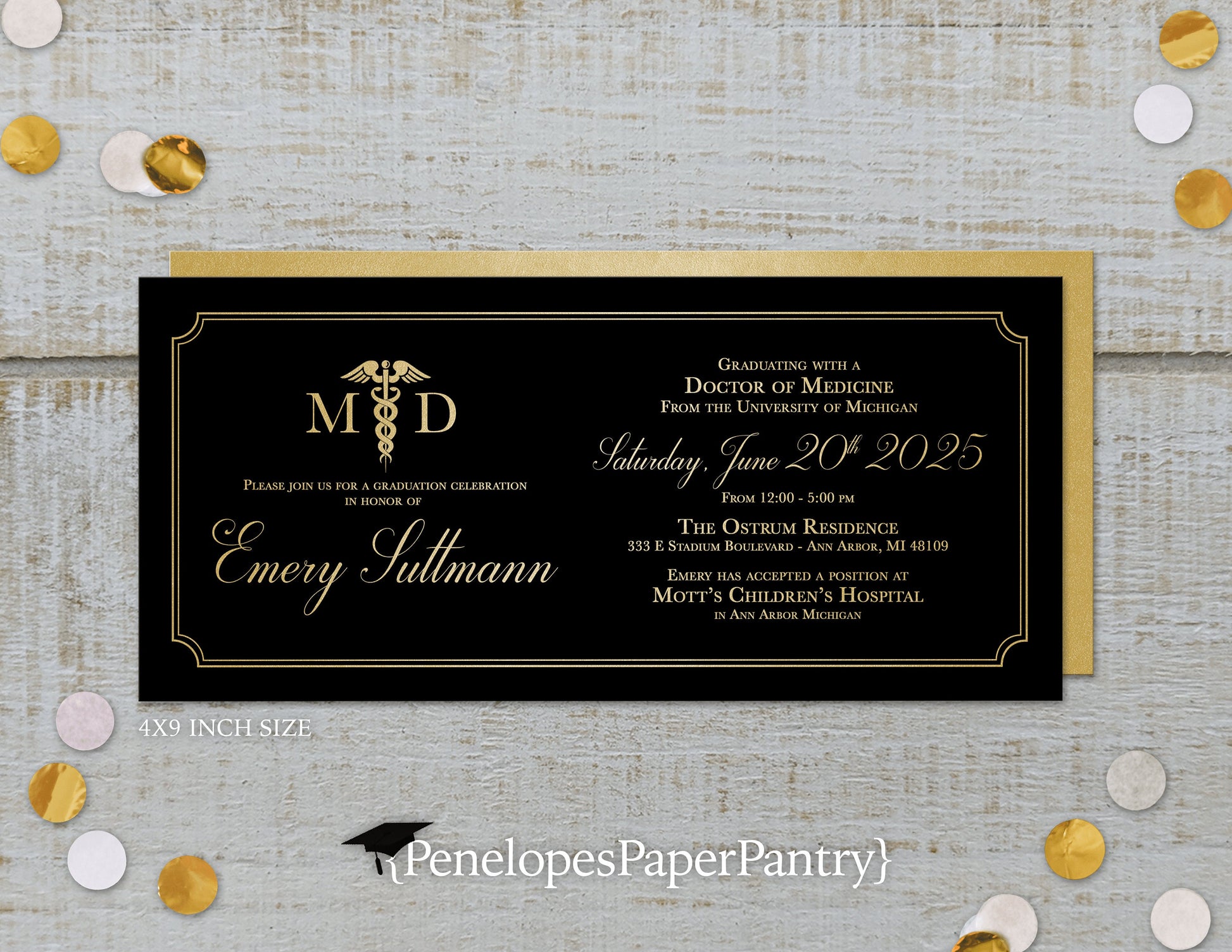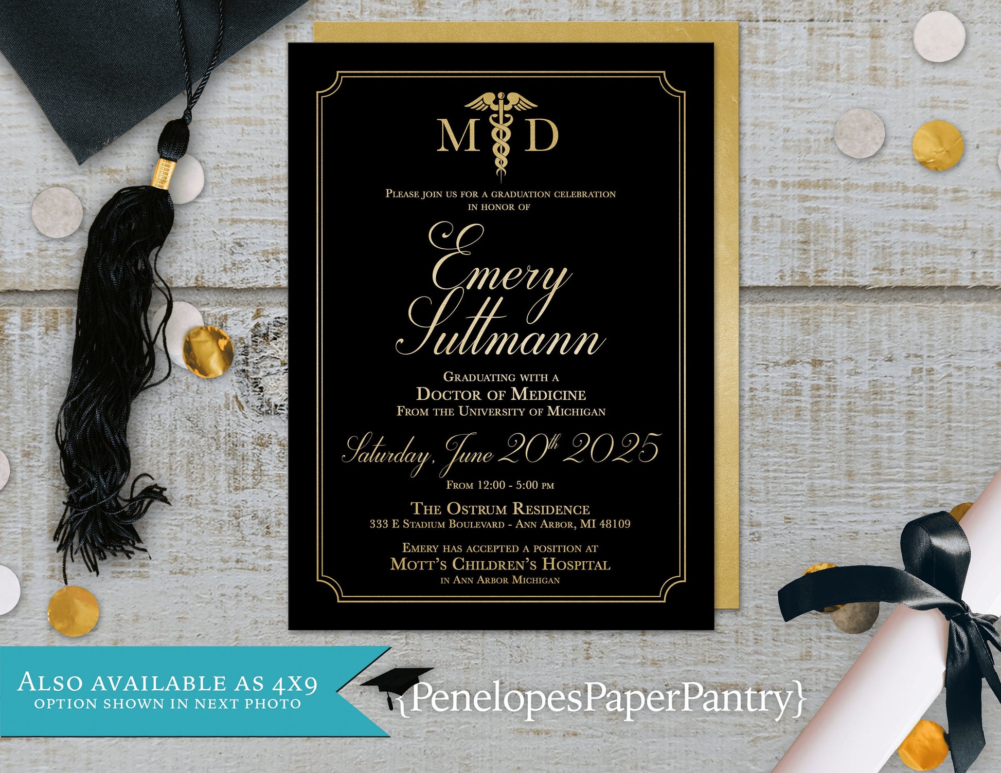 Medical Degree Rod of Asclepius Black on Metallic Gold Paper Graduation Open House or Ceremony Invitation