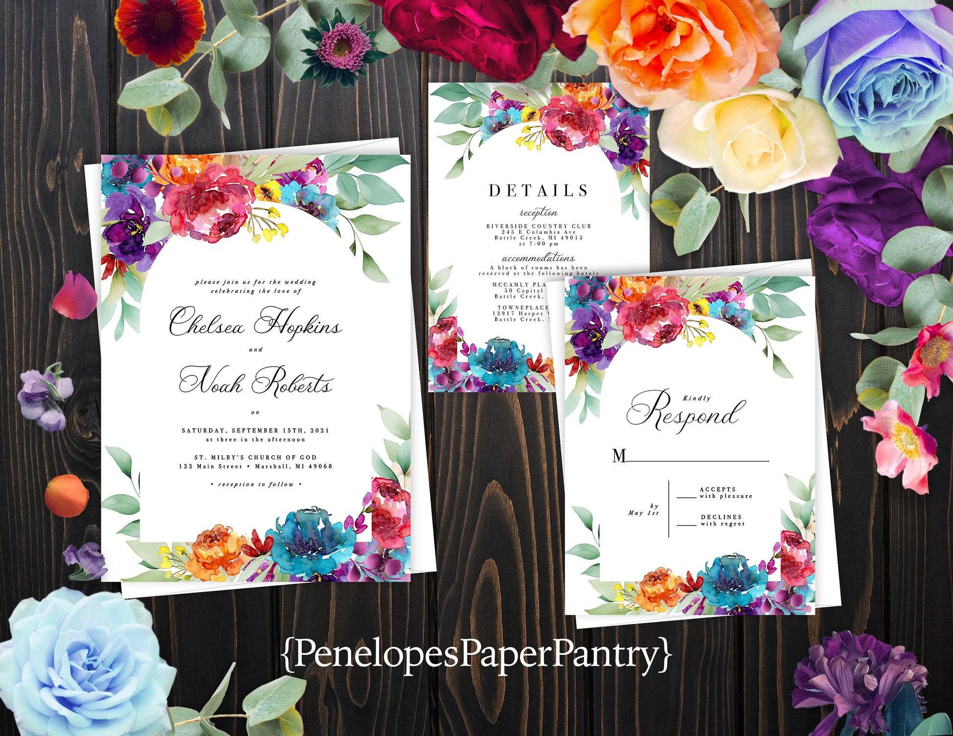 Elegant Bright Floral Summer Wedding Invitation Personalized Vibrant Colors Calligraphy Printed Invitations Envelopes Included Optional RSVP