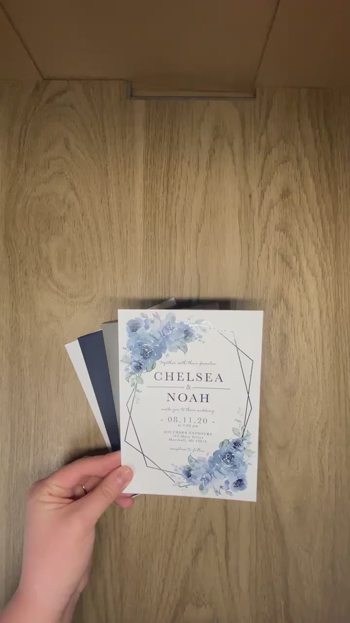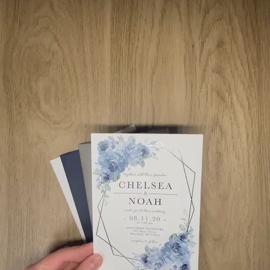 Elegant Dusty Blue Floral Summer Wedding Invitation Personalized Geometric Frame Silver Foil Printed Invitations Envelopes Included Unique