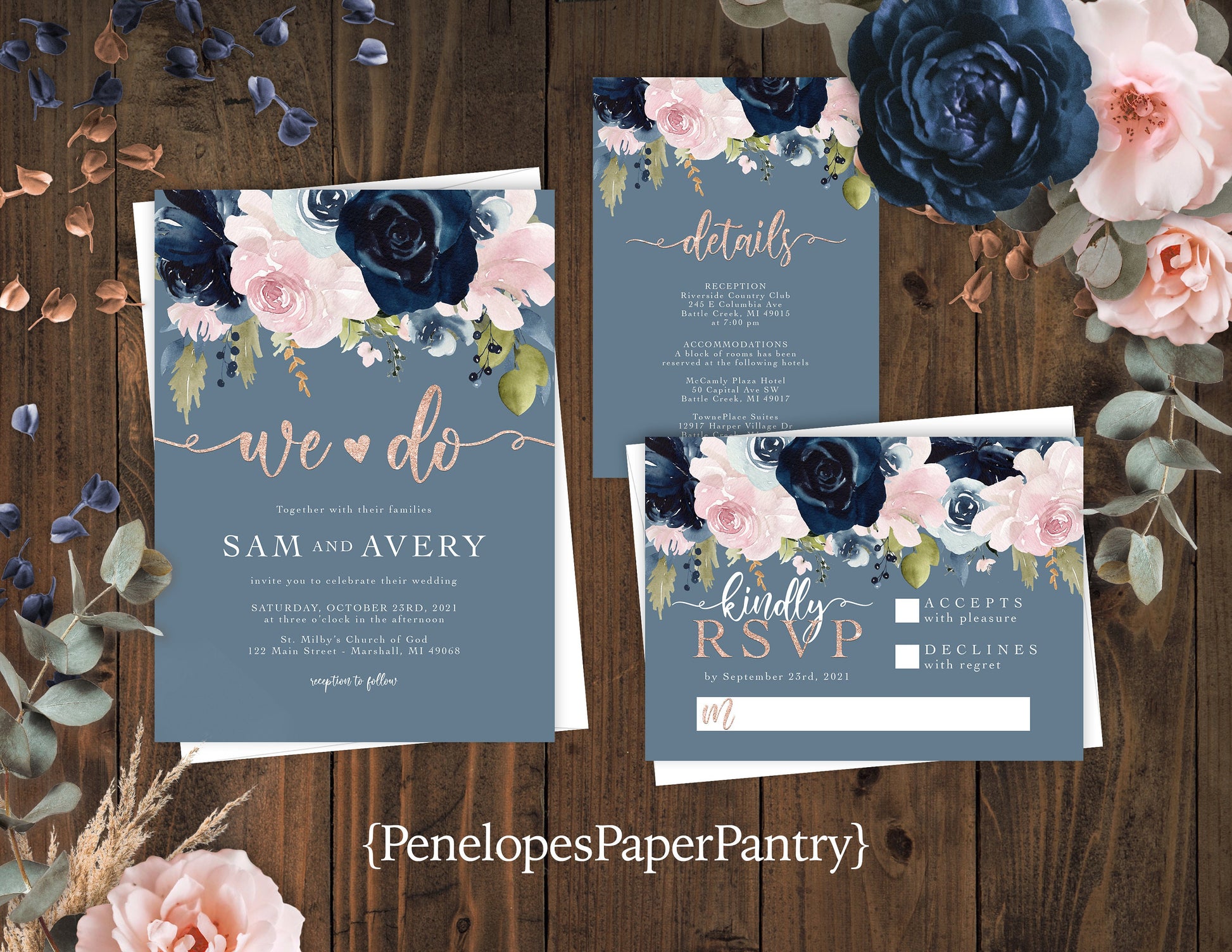 Elegant Dusty Blue Floral Summer Wedding Invitation Personalized Navy Blush Roses Glitter Print Shimmery Printed Invitations With Envelopes
